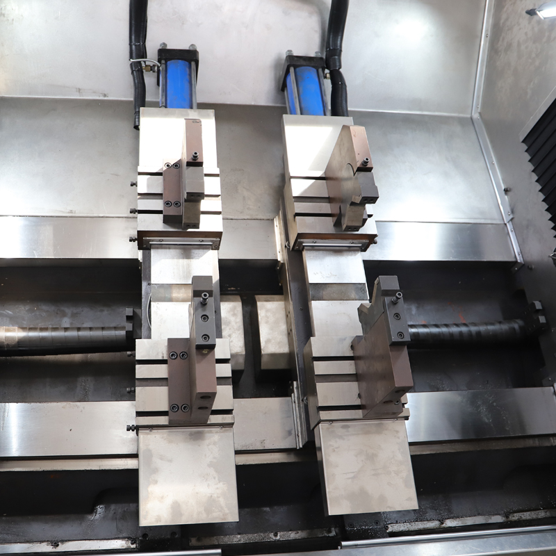 工件采用大行程自定心同步夹钳夹紧,设备设有轴向定位系统,方便大型工件的自动轴向定位功能。
